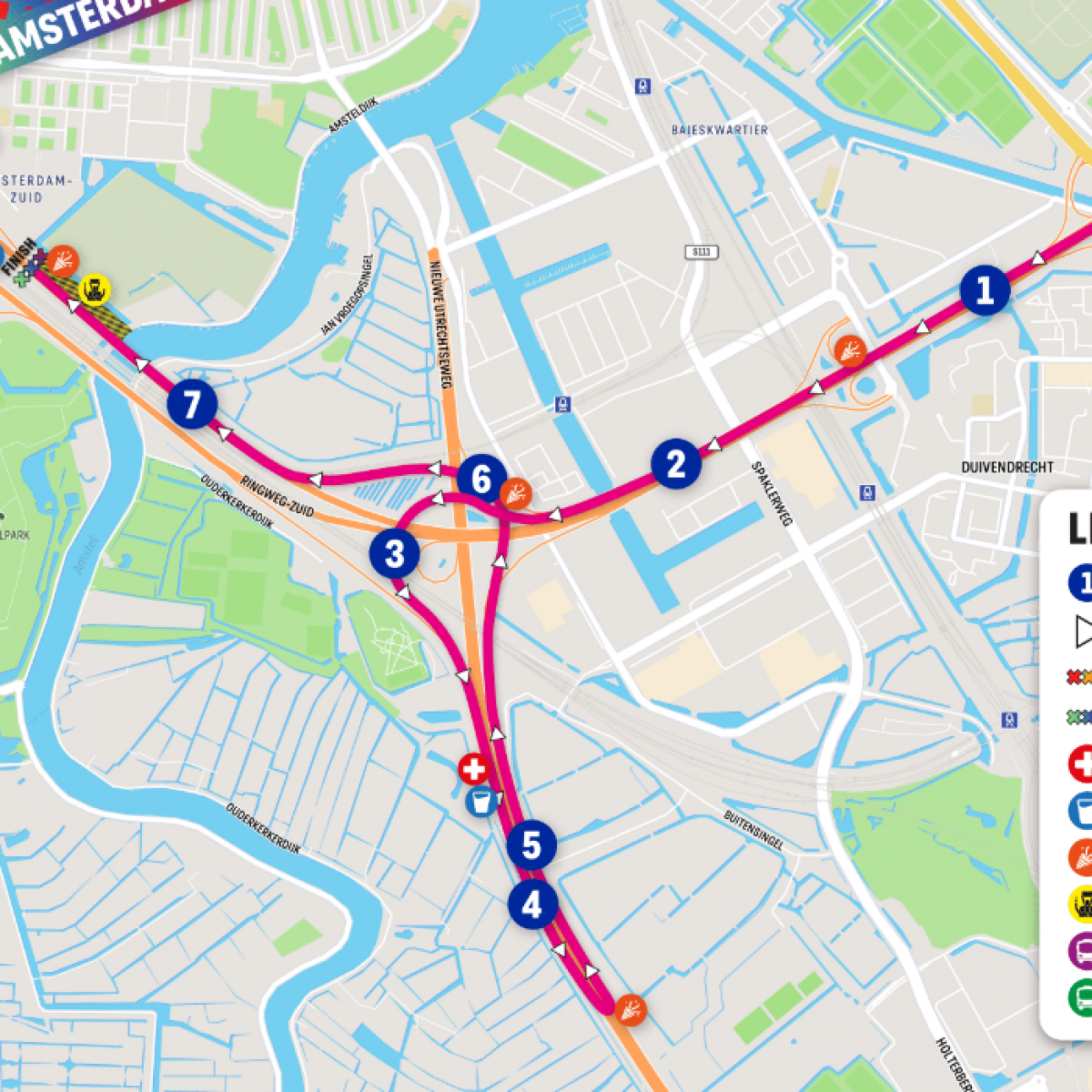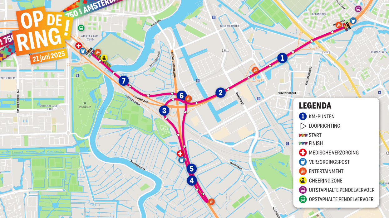 De Elevation Group Run Op de Ring start bij Watergraafsmeer (S113), waar deelnemers zich klaarmaken voor een unieke loopervaring over de ring van Amsterdam. Vanaf hier ren je over de afgesloten snelweg, een kans die je niet vaak krijgt!
